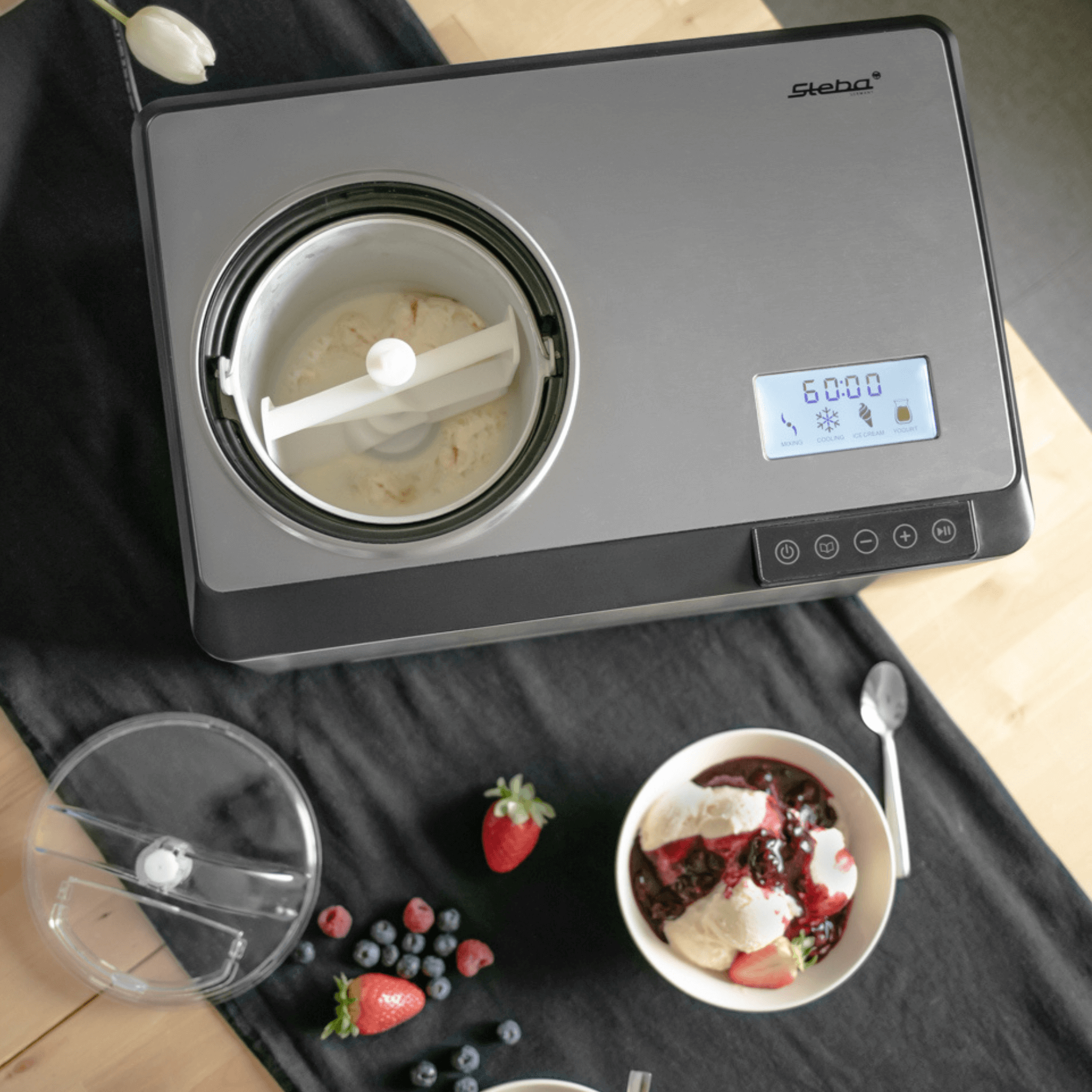 Leckere selbstgemachte Eiscreme individuell nach Ihrem Geschmack? Mit der Steba Eismaschine IC 180 ist das kein Problem! Dank des selbstkühlenden Kompressors ist die Eismaschine sofort einsatzbereit – ohne Vorkühlen. Bei 2,0 l Volumen können somit bis zu 25 Kugeln Eis produziert werden. Das LED-Display, der Timer und der entnehmbare Edelstahl-Eisbehälter bieten einen hohen Bedienkomfort und machen die Reinigung spielend einfach.