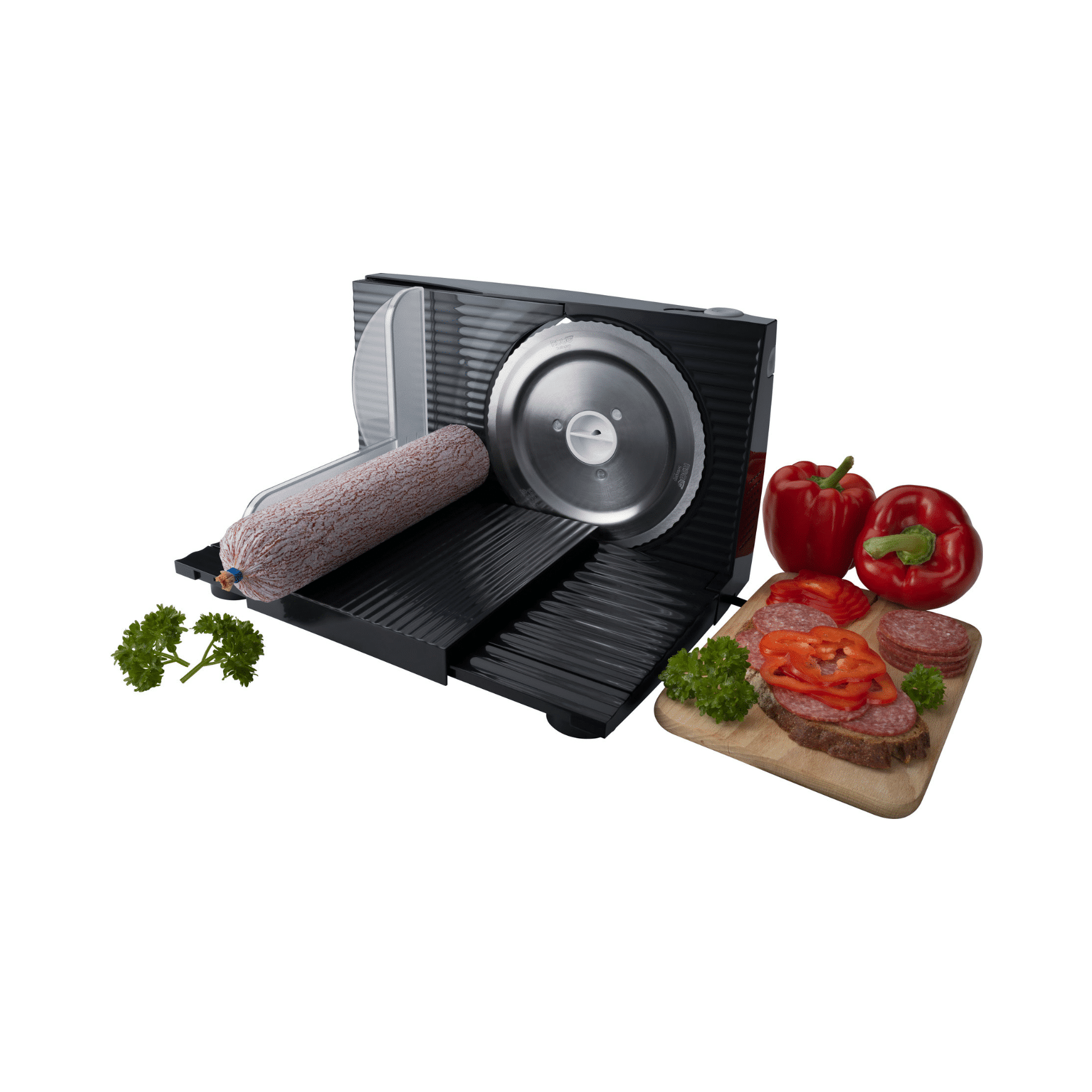 Der elektrische Küchenhelfer erlaubt ein komfortables und schnelles Verarbeiten von Lebensmitteln. Ob hauchdünn oder bis 17 mm dick – über die stufenlose Schnittstärkeeinstellung schneiden Sie gleichmäßige Scheiben ganz nach Ihren Wünschen.
