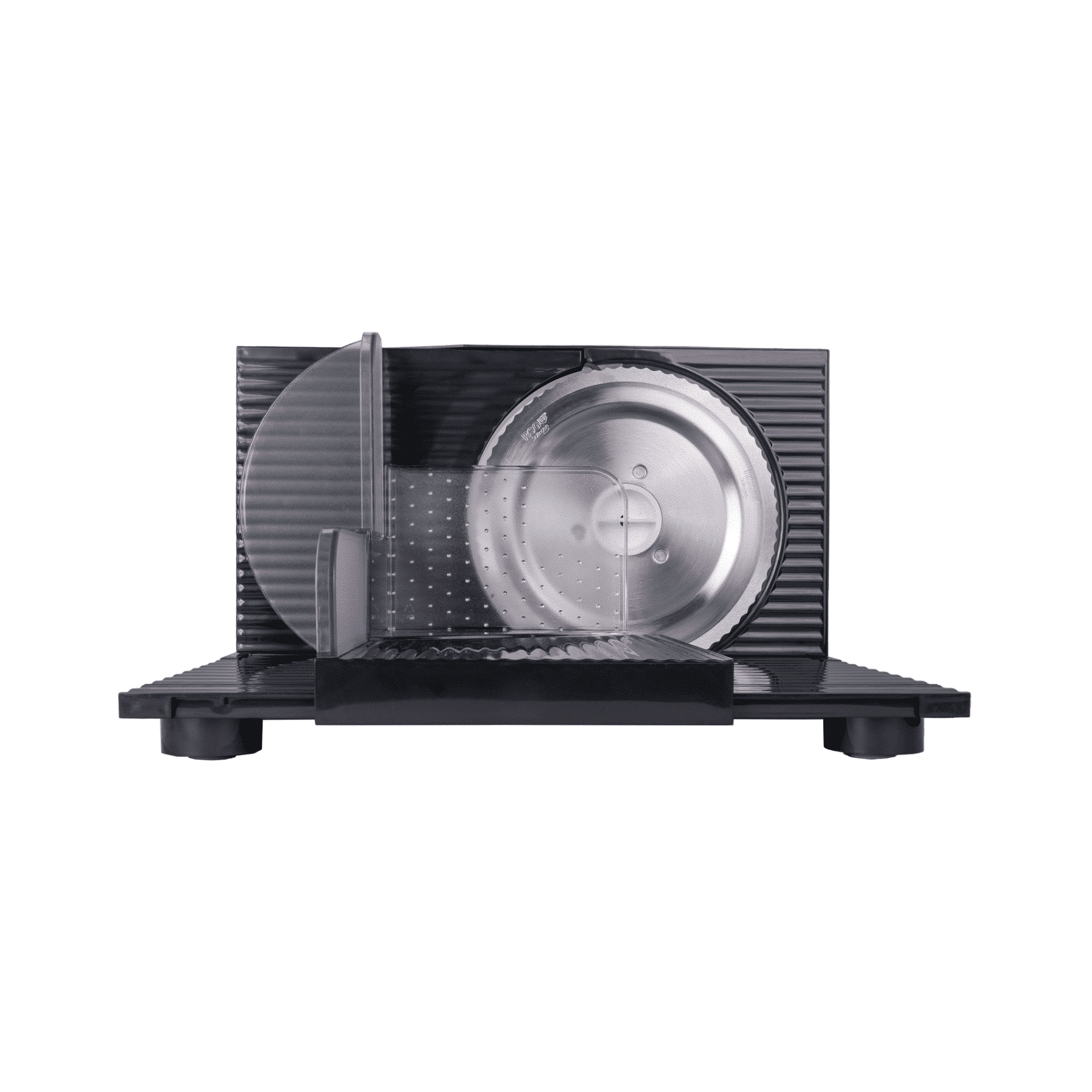 Ein doppelter Sicherheitsschalter, leichtgängiger Schlitten mit Handschutz und Lebensmittelhalter sowie rutschfeste Gummifüße und eine Kabelaufwicklung sorgen für ein sicheres Schneideerlebnis und einen festen Halt während des Betriebs.