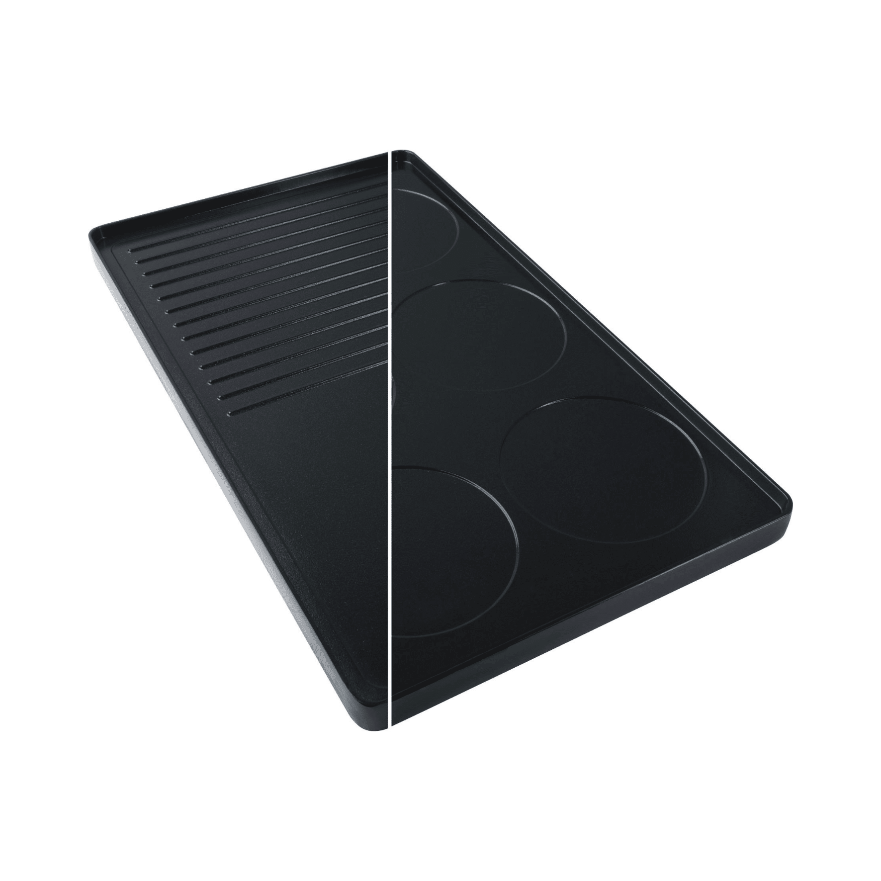 Die wendbare Grillplatte bietet maximale Vielseitigkeit: klassisches Grillmuster für charakteristische Röstaromen, glatte Fläche für empfindliche Zutaten wie Fisch und eine Crêpes-Prägung für den süßen Abschluss. Acht PFAS-freie, antihaftbeschichtete Pfännchen sorgen dafür, dass nichts haften bleibt und die Reinigung im Handumdrehen erledigt ist.