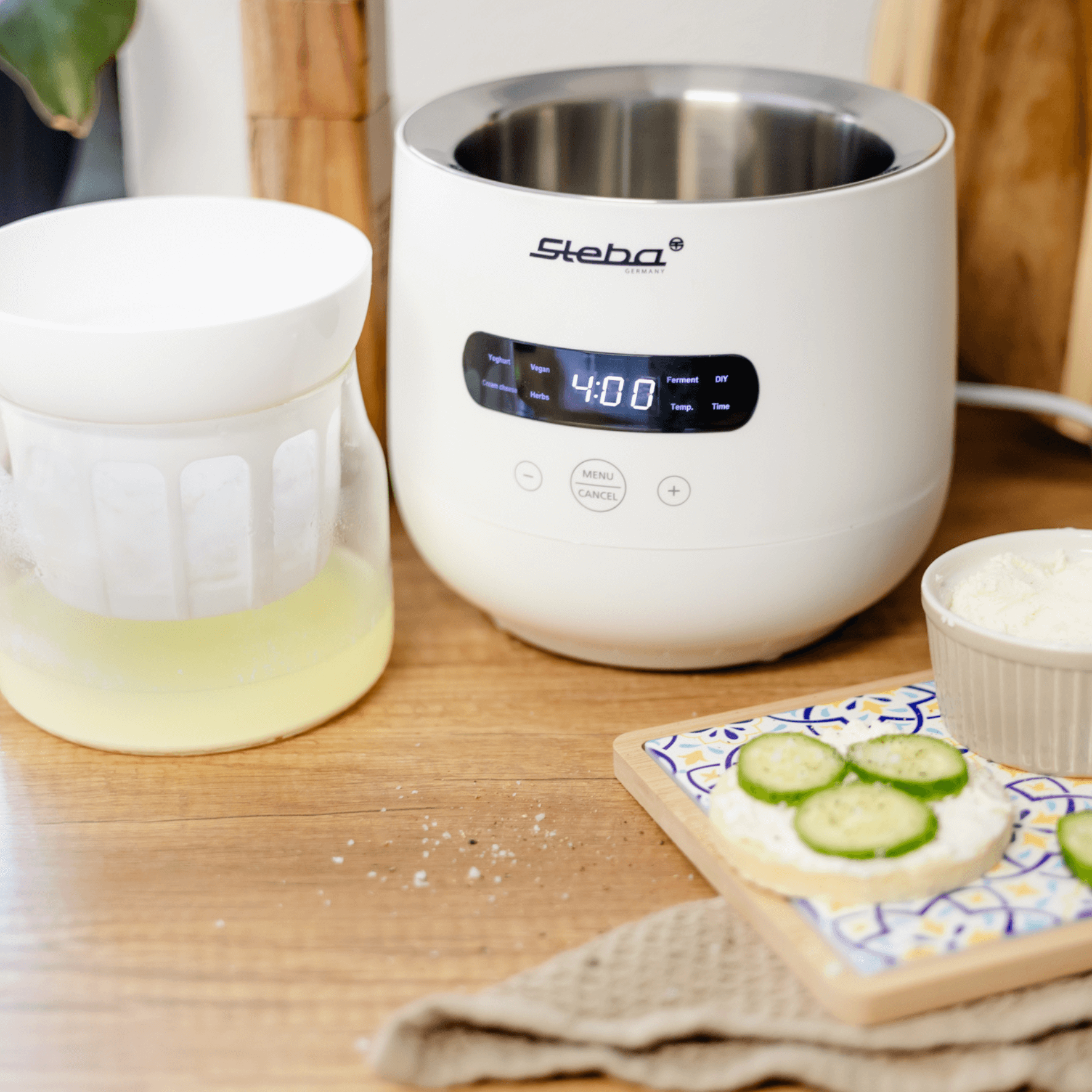 Für hohen Bedienkomfort sorgen die fünf Automatikprogramme, die unter anderem für Naturjoghurt, Fermentieren, Frischkäse, Kräuteröl/-Essig und für veganen/laktosefreien Joghurt genutzt werden können. Ebenso kann man mit dem DIY-Programm auch die individuelle Temperatur und Zeit wählen.
