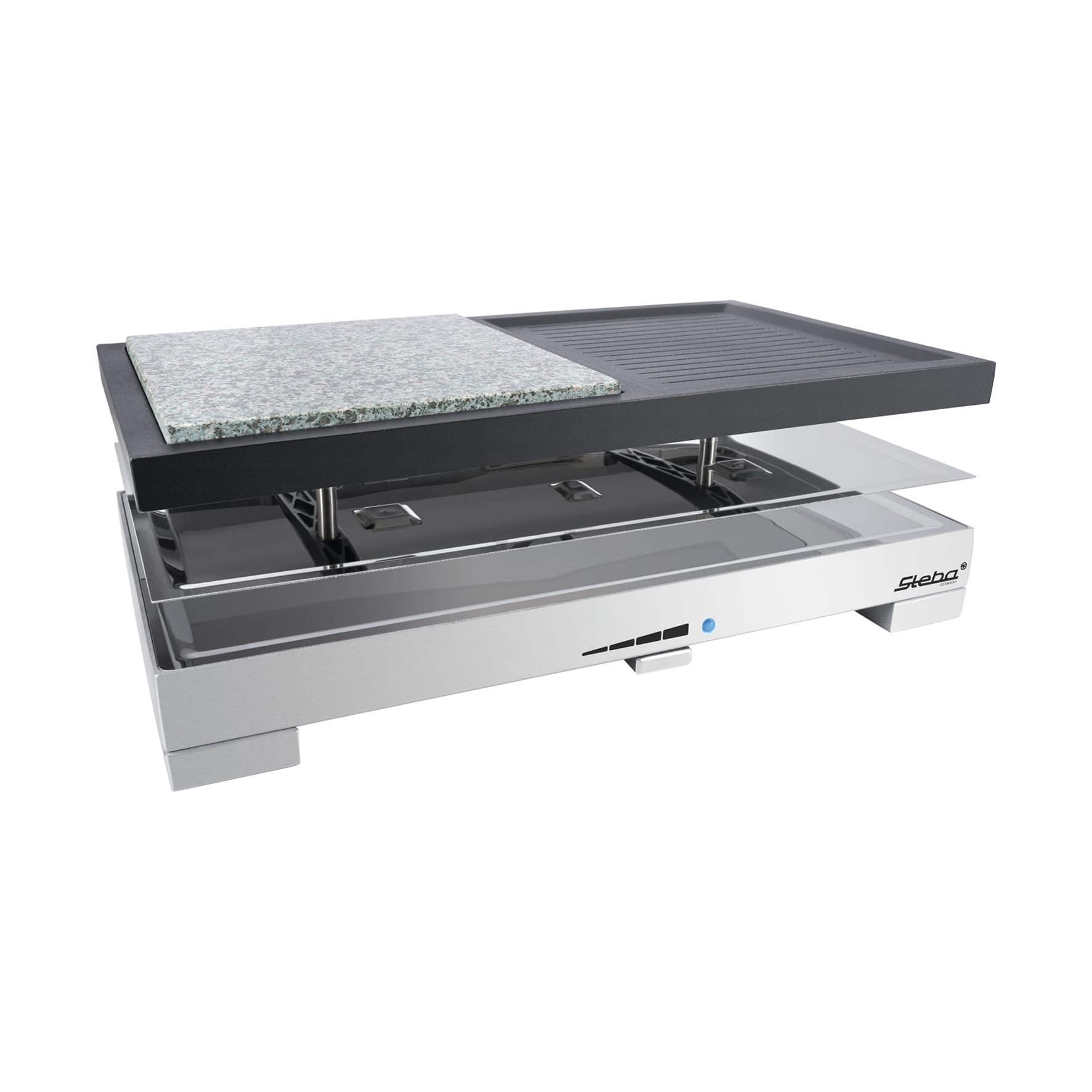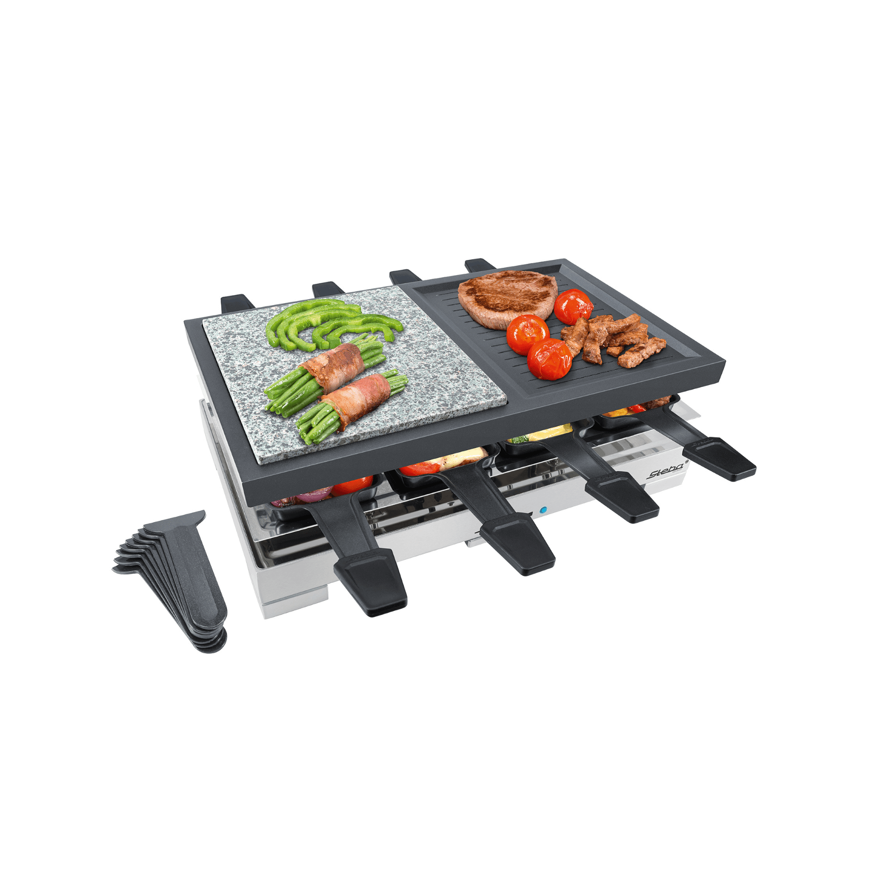 Das RC 88 verfügt zusätzlich über eine Natursteingrillplatte. Beim Grill auf dem natürlichen Lavastein kann auf Fett fast ganz verzichtet werden und nichts brät an. Der Stein speichert die Wärme und gibt sie gleichmäßig wieder ab – damit erreichen Sie optimale Grillergebnisse. Auch das Schneiden von Fleisch auf dem Stein ist kein Problem, denn er ist schneid- und kratzfest. Somit haben Sie beim RC 88 gleich 2 Zubereitungsarten – dem klassischem Raclette und dem heißen Stein.